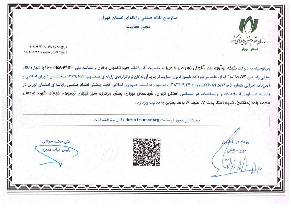 | صدور مجوز و اعتبار قانونی | اعطای گواهی رسمی و کارت عضویت که نشاندهنده مجاز بودن قانونی برای فعالیت در حوزه ICT است و اعتبار کسبوکار را افزایش میدهد. |