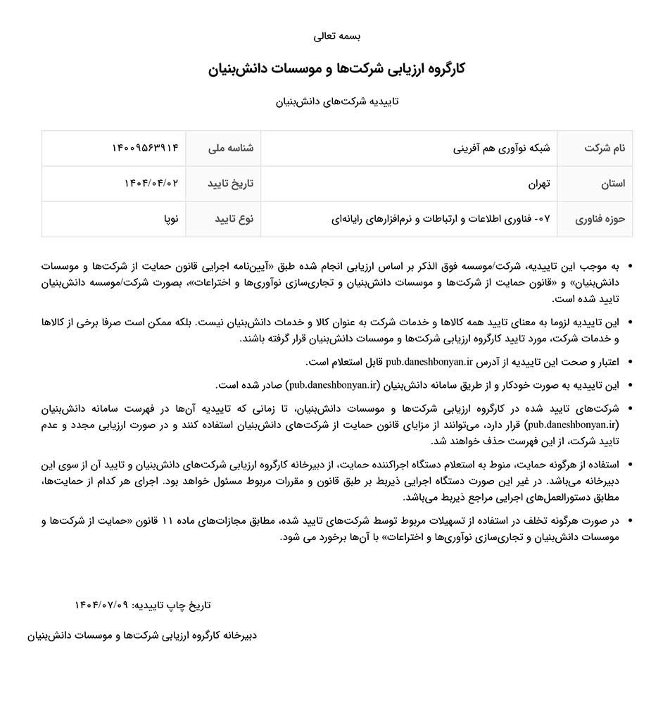 گواهینامه دانشبنیان «نوپا نوع ۱» از معاونت علمی و فناوری ریاست جمهوری، سطحی از ارزیابی برای شرکتهای نوپا مبتنی بر فناوری پیشرفته است. این تاییدیه نشاندهنده نوآوری برجسته، ارزش افزوده فراوان و پتانسیل تجاریسازی نتایج تحقیق و توسعه در محصولات و خدمات ما در حوزه فناوری اطلاعات و ارتباطات میباشد و ما را در مسیر توسعه اقتصاد دانشمحور، گسترش کاربرد اختراعات و نوآوریها، و بهرهمندی از حمایتهای قانونی (مانند معافیتهای مالیاتی برای محصولات سطح ۱) یاری میرساند.